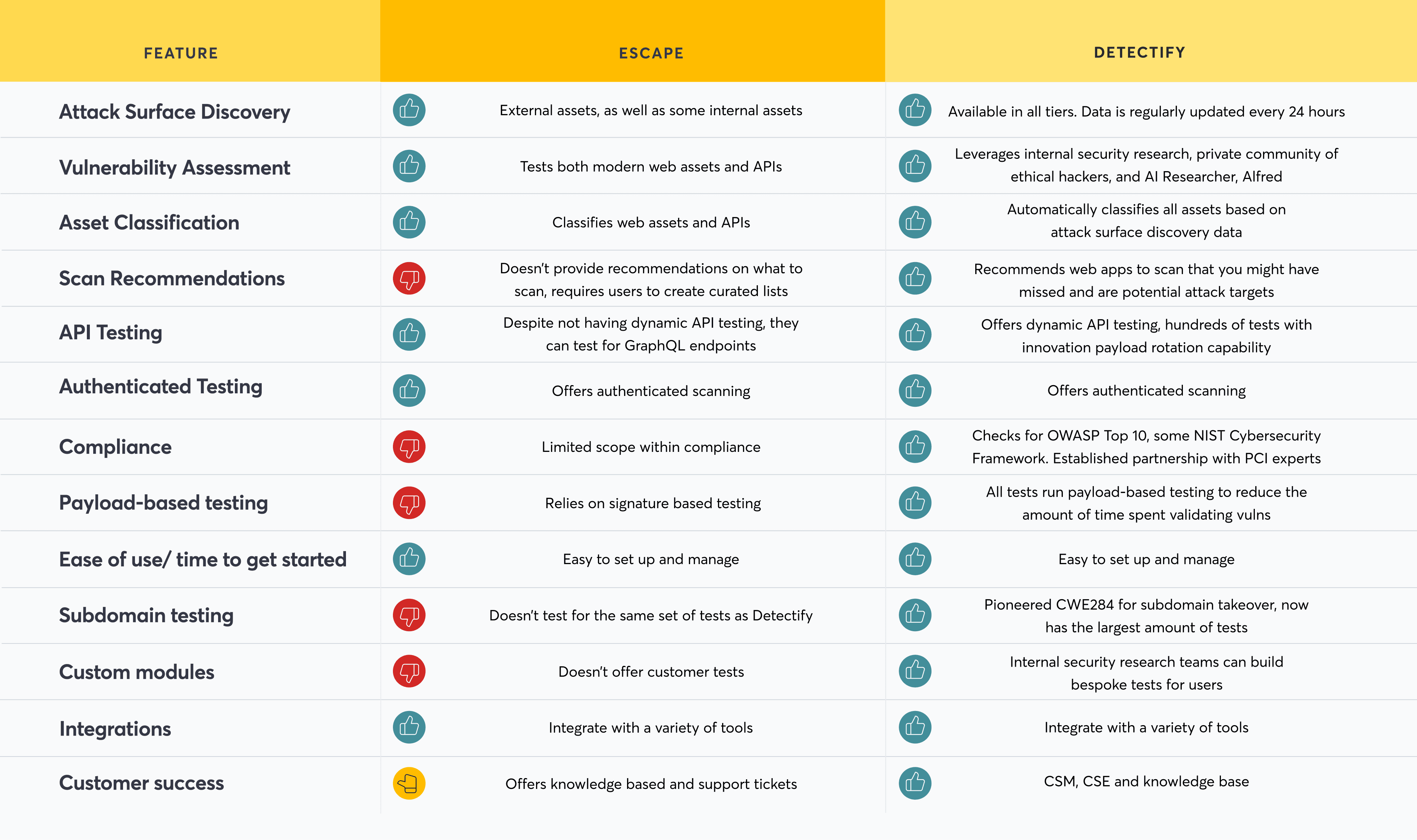 An image showing a comparative feature chart between Escape and Detectify. The chart has three columns: FEATURE, ESCAPE, and DETECTIFY, which detail how each product handles the specific feature. The features and their corresponding comparison points are:
